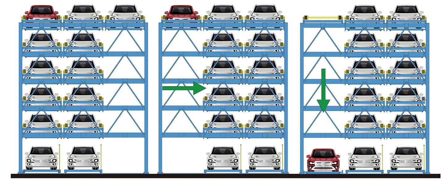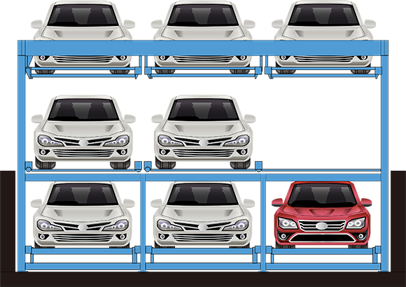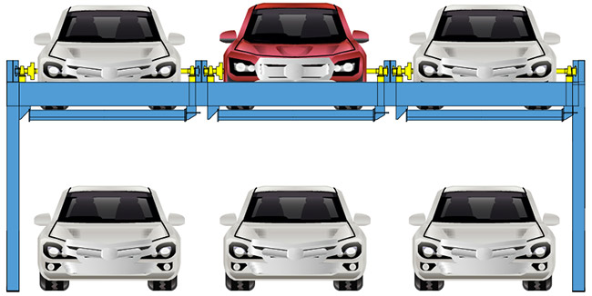 升降橫移式類停車設(shè)備工作時(shí)要留有交換車位,即空車位,其有效停車數(shù)量的計(jì)算并不是地面停車位數(shù)與層數(shù)的簡(jiǎn)單疊加,通常把較大型的車庫(kù)劃分成若干個(gè)單元,一個(gè)單元只能按先、后一人進(jìn)行存、取車的操作,不能兩人或多人同時(shí)進(jìn)行。